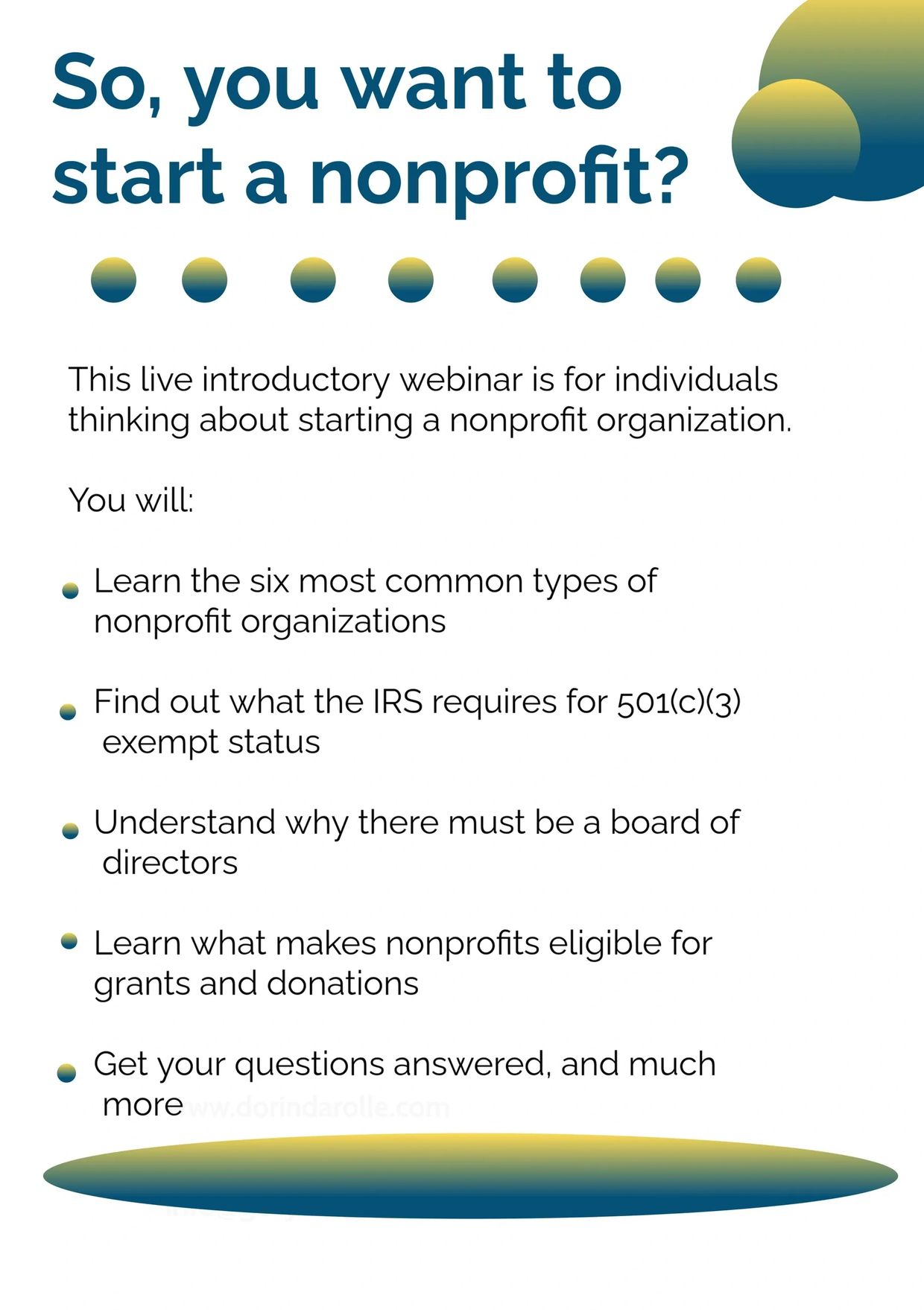 This live introductory webinar is for individuals thinking about starting a nonprofit organization. You will learn what it takes to start a nonprofit organization, whether you have a cause close to your heart, want to make a difference or you are simply curious, this event is perfect for you.